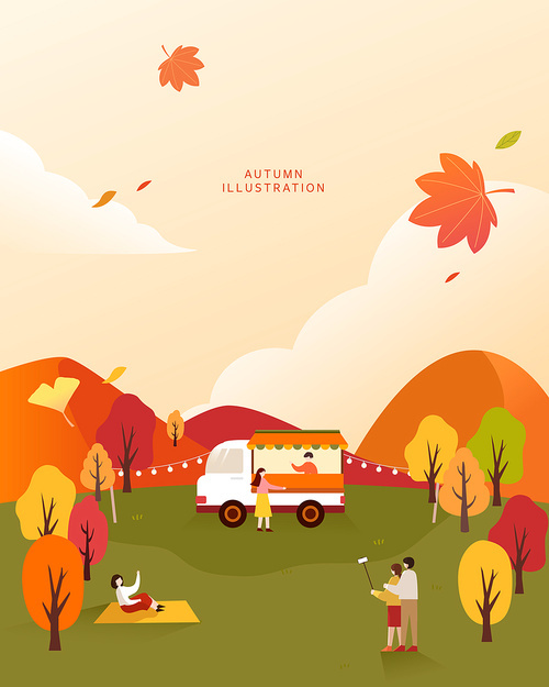 Family illustrations that enjoy spring picnic outing in the flower garden